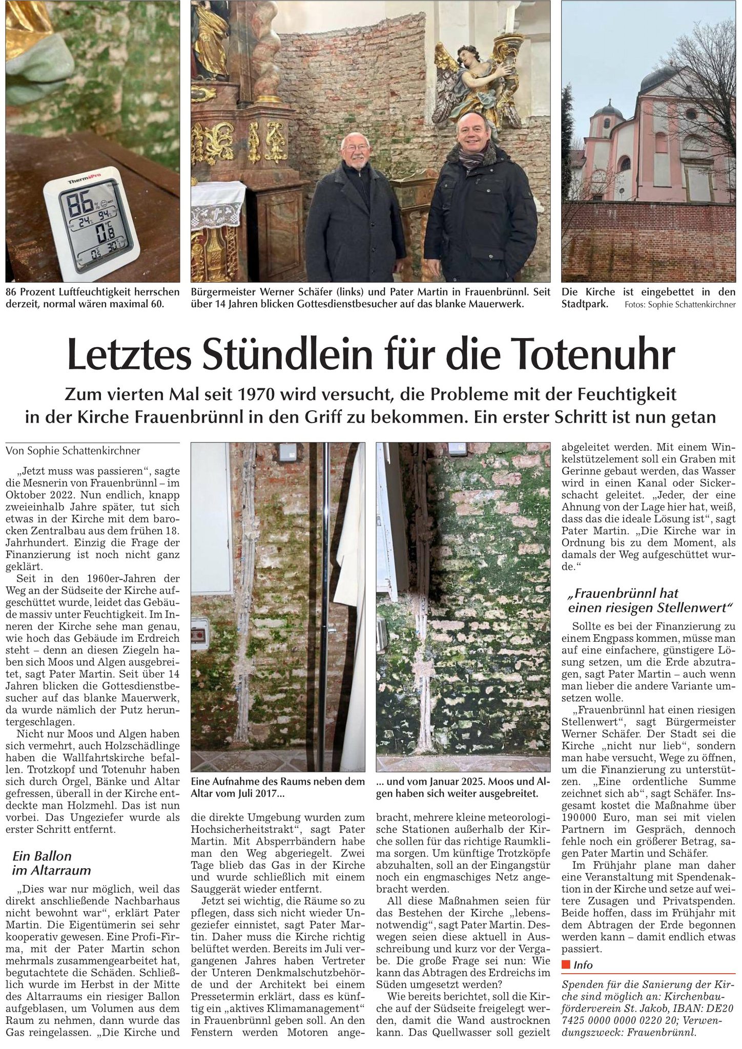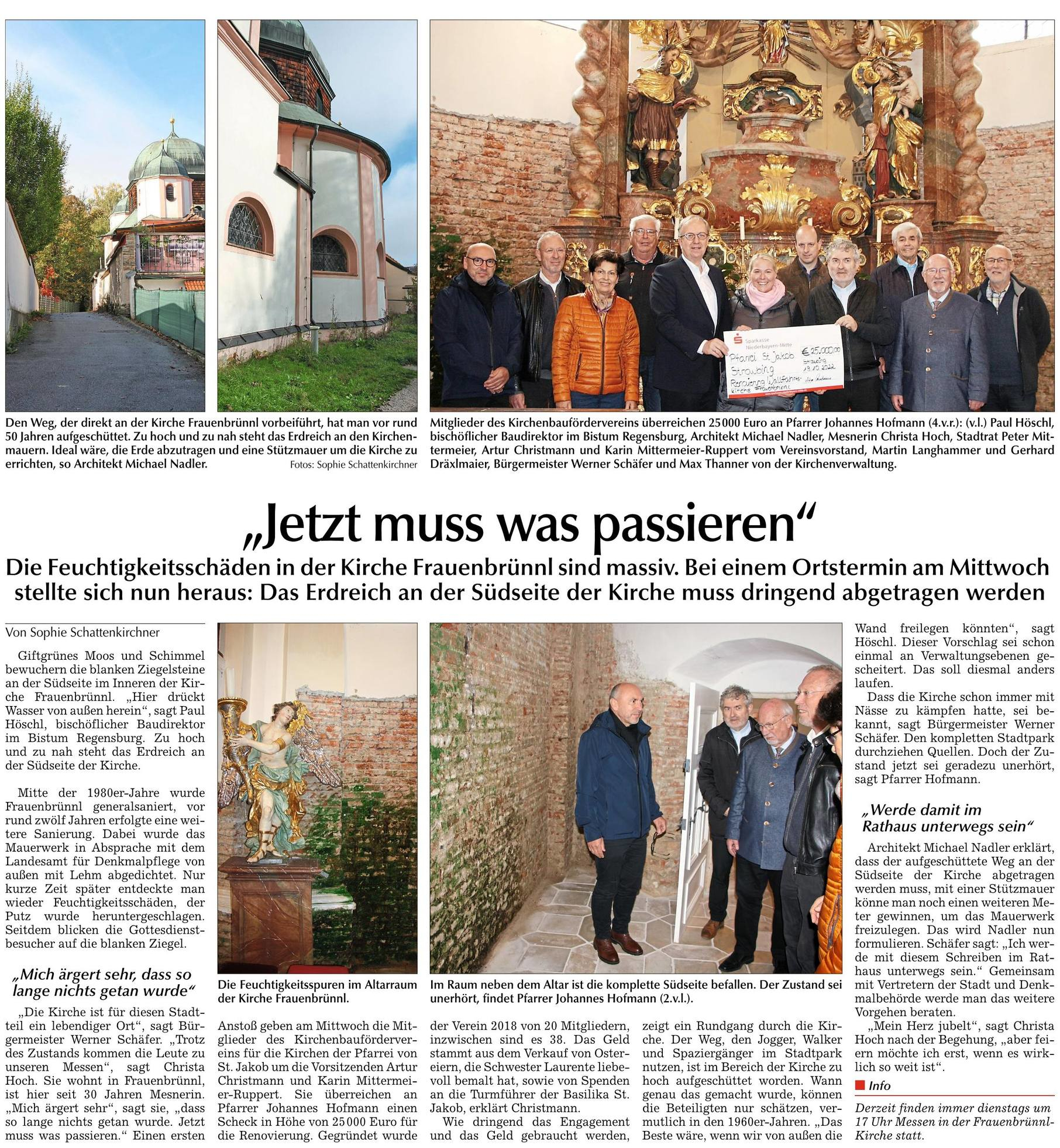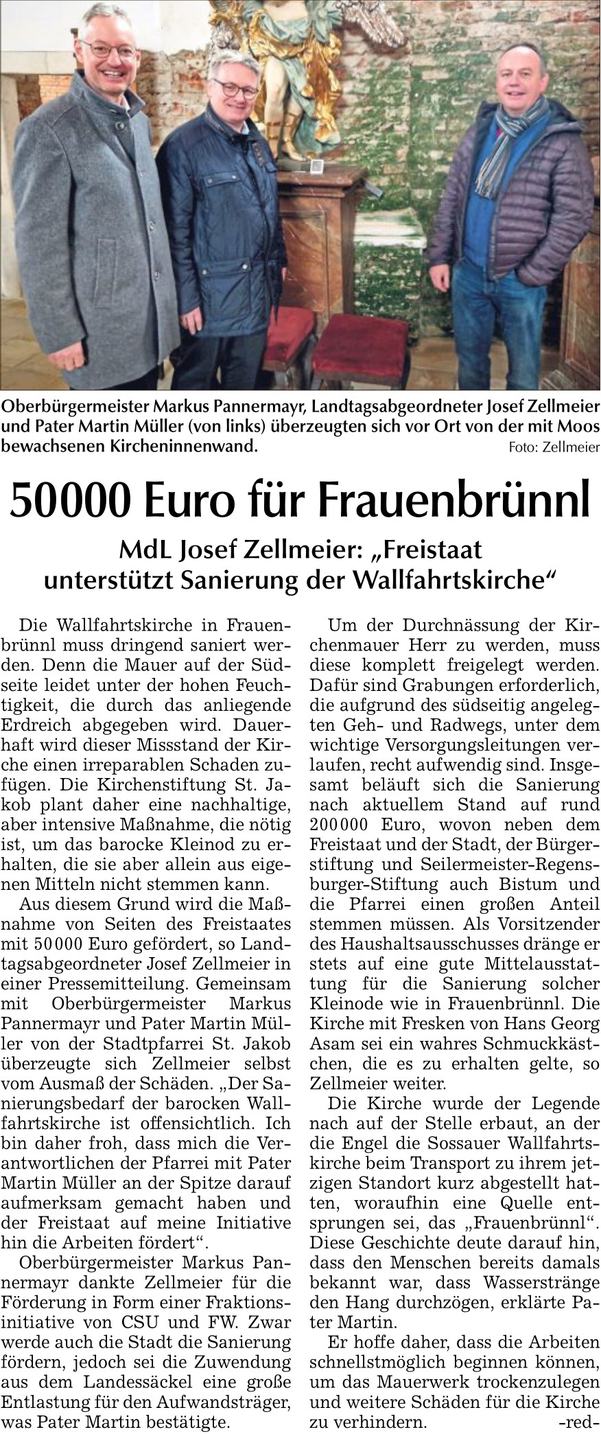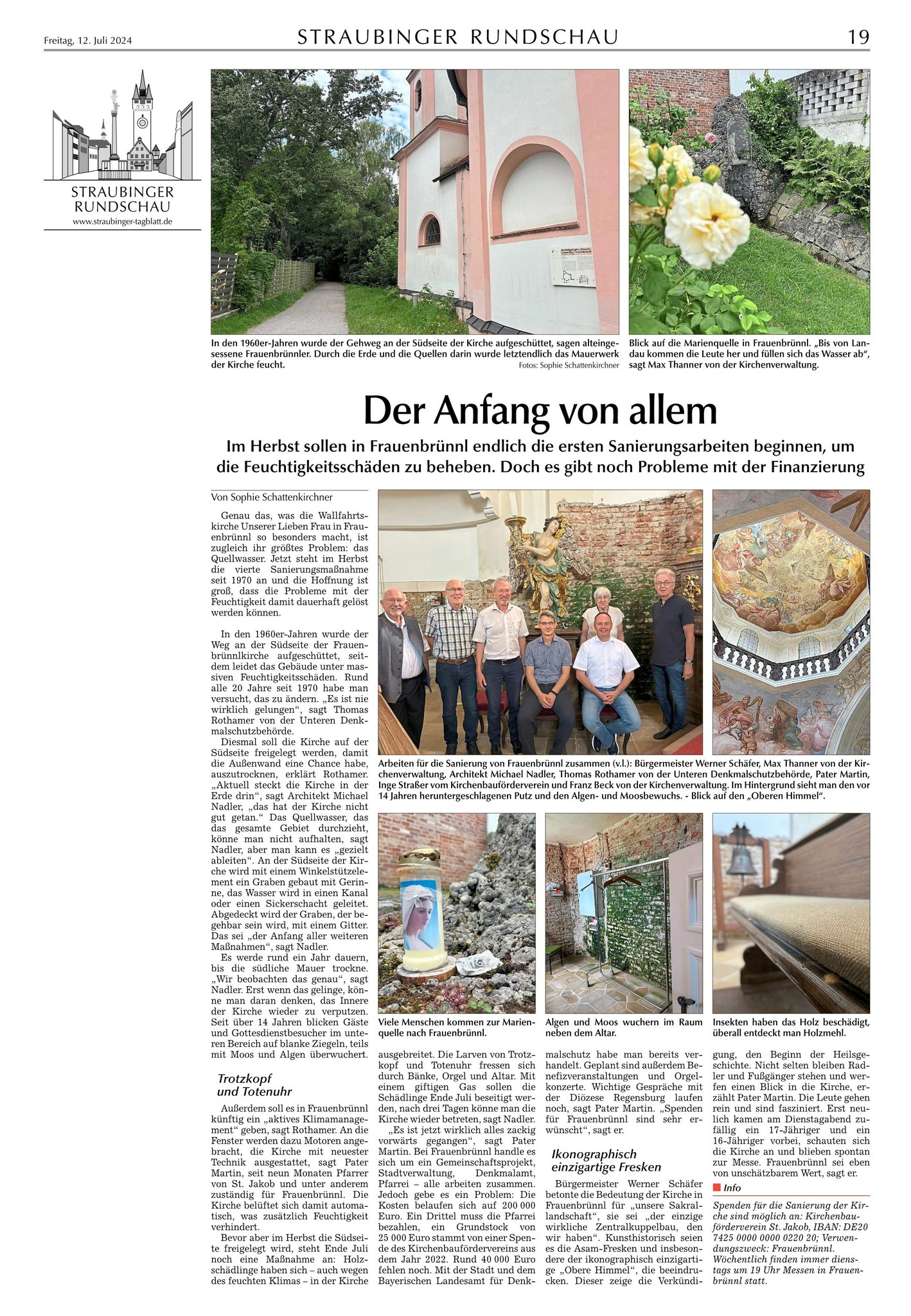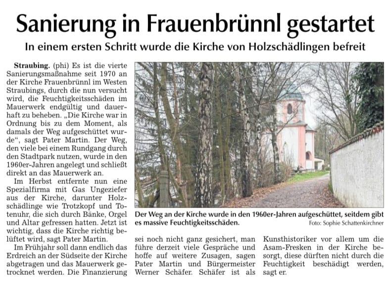 Die Wallfahrtskirche Frauenbrünnl, geweiht im Jahr 1707, ist ein Zentralbau von epochaler Bedeutung. Zum ersten Mal im Straubinger Raum freskierte die Werkstatt des Hans Georg Asam einen deckenüberspannenden Heiligenhimmel zur Ehre Mariens.